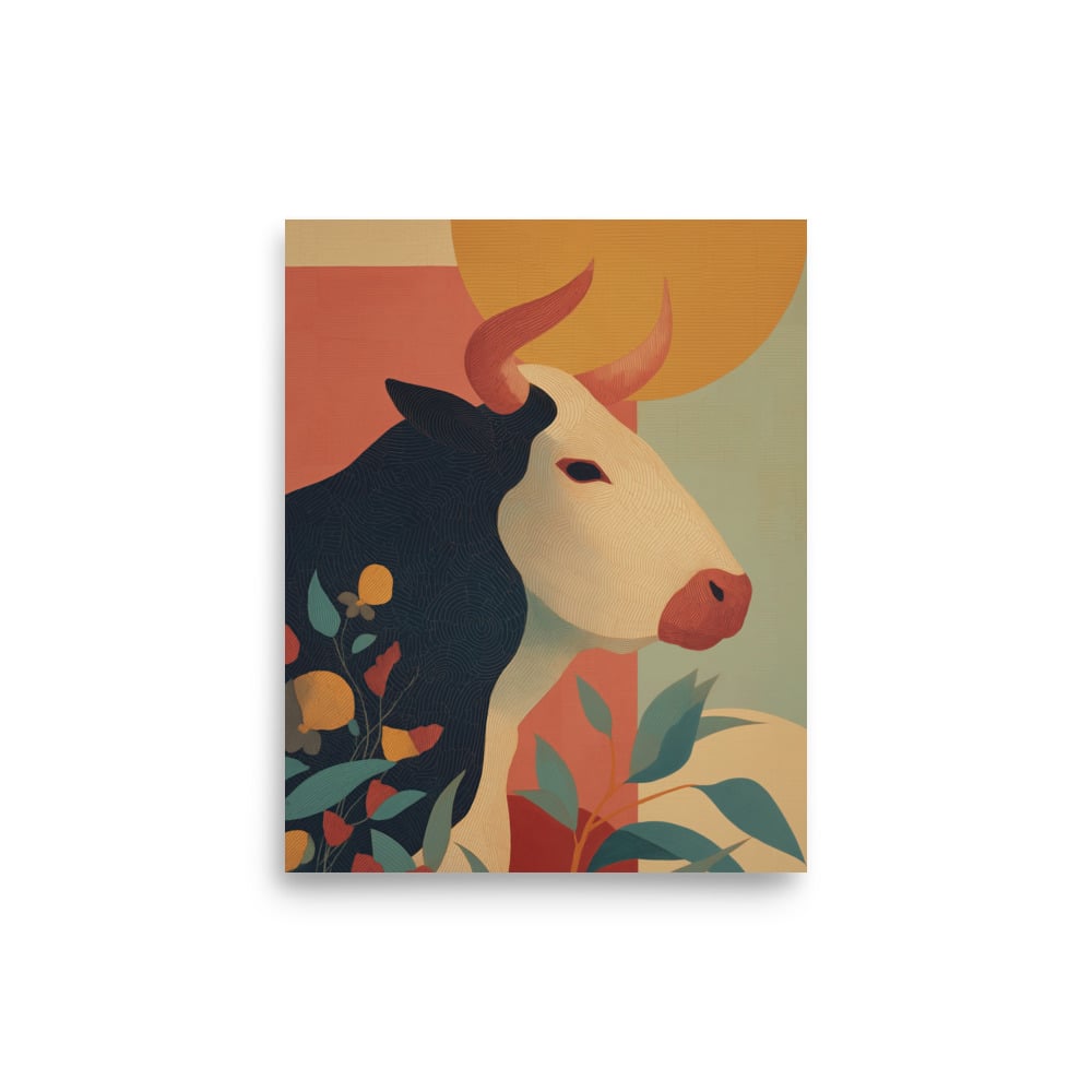 A simple, graphic bull rendered in a folk art style, using bold shapes and a limited color palette. The design focuses on clean lines and balanced composition, giving the piece a strong but approachable feel. Inspired by traditional craftsmanship, it brings a touch of rustic character without feeling overly detailed or ornate.