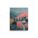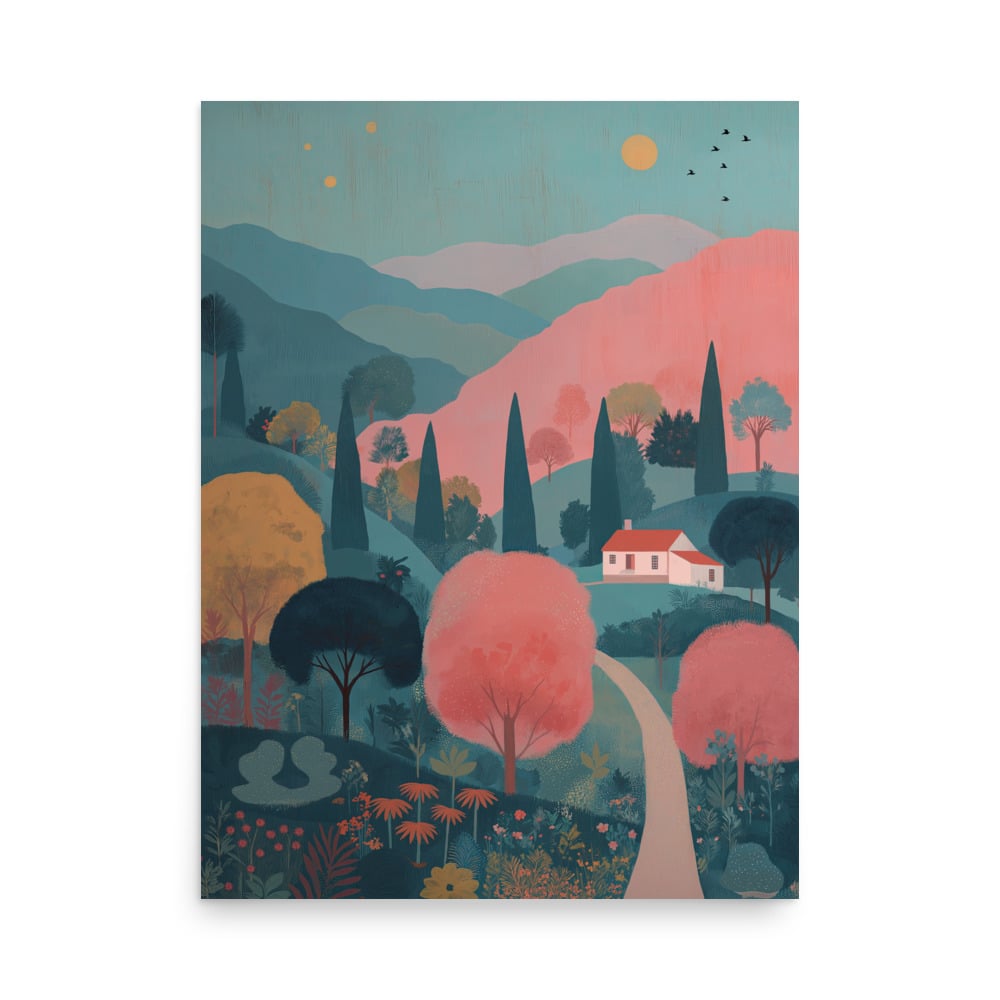 A country house scene based on an original gouache painting, translated into a folk art–inspired print with clean shapes, simple trees, and small clusters of flowers. The composition uses color contrast to define the forms while keeping the layout balanced and easy to read. It’s straightforward and grounded, with a quiet, rural feel and minimal detail.